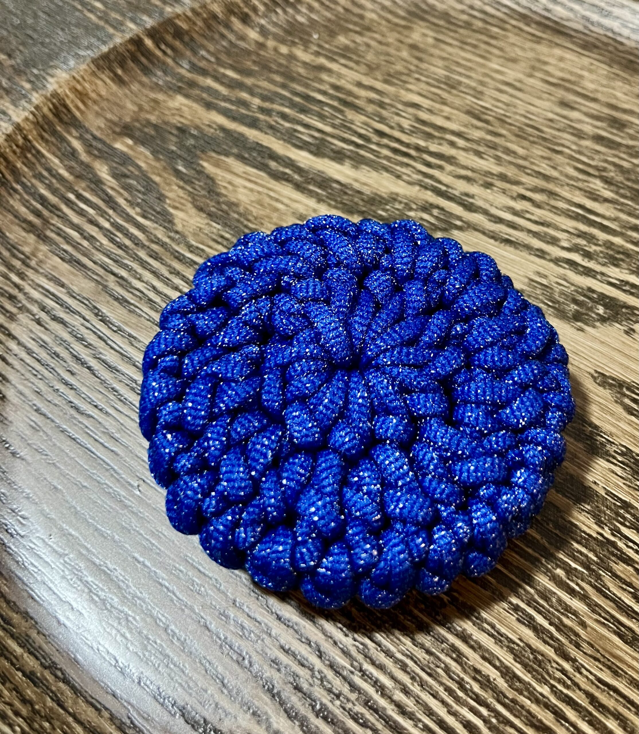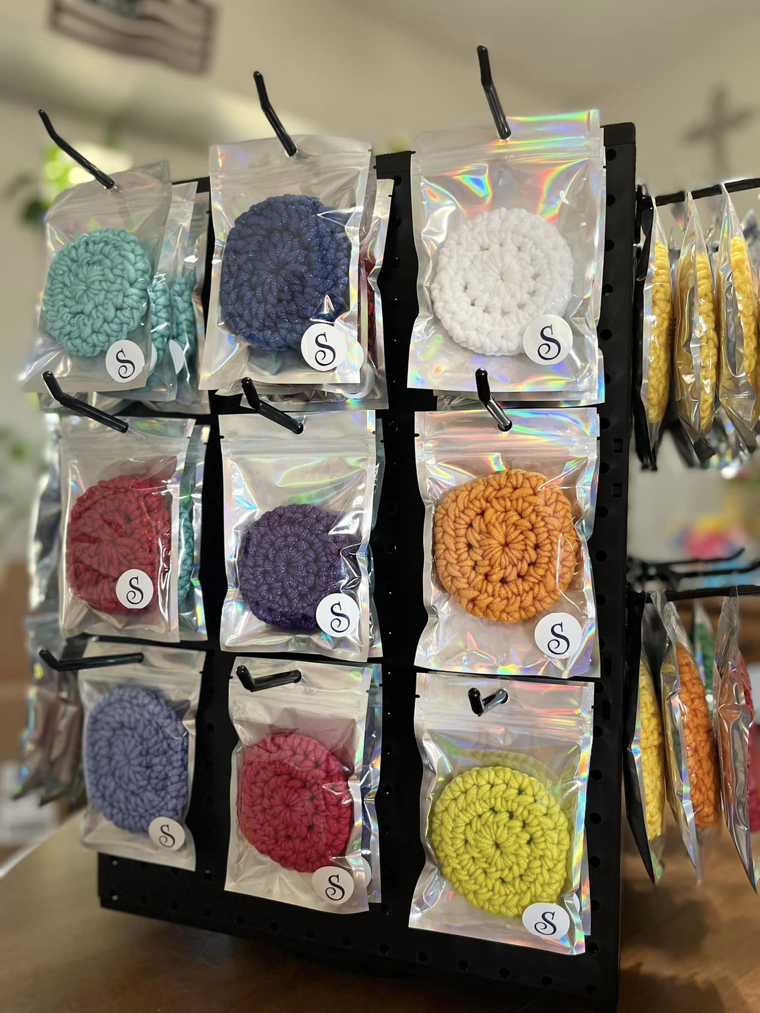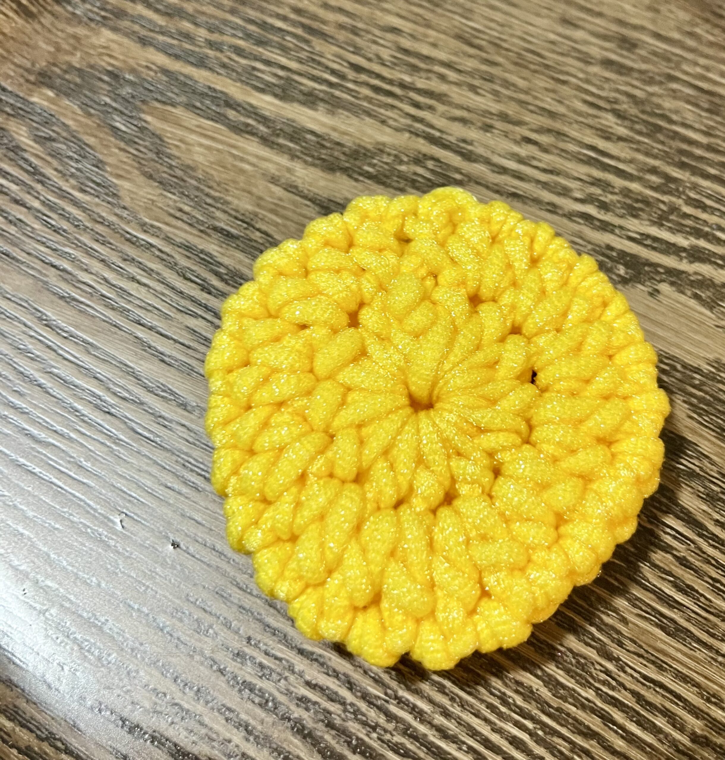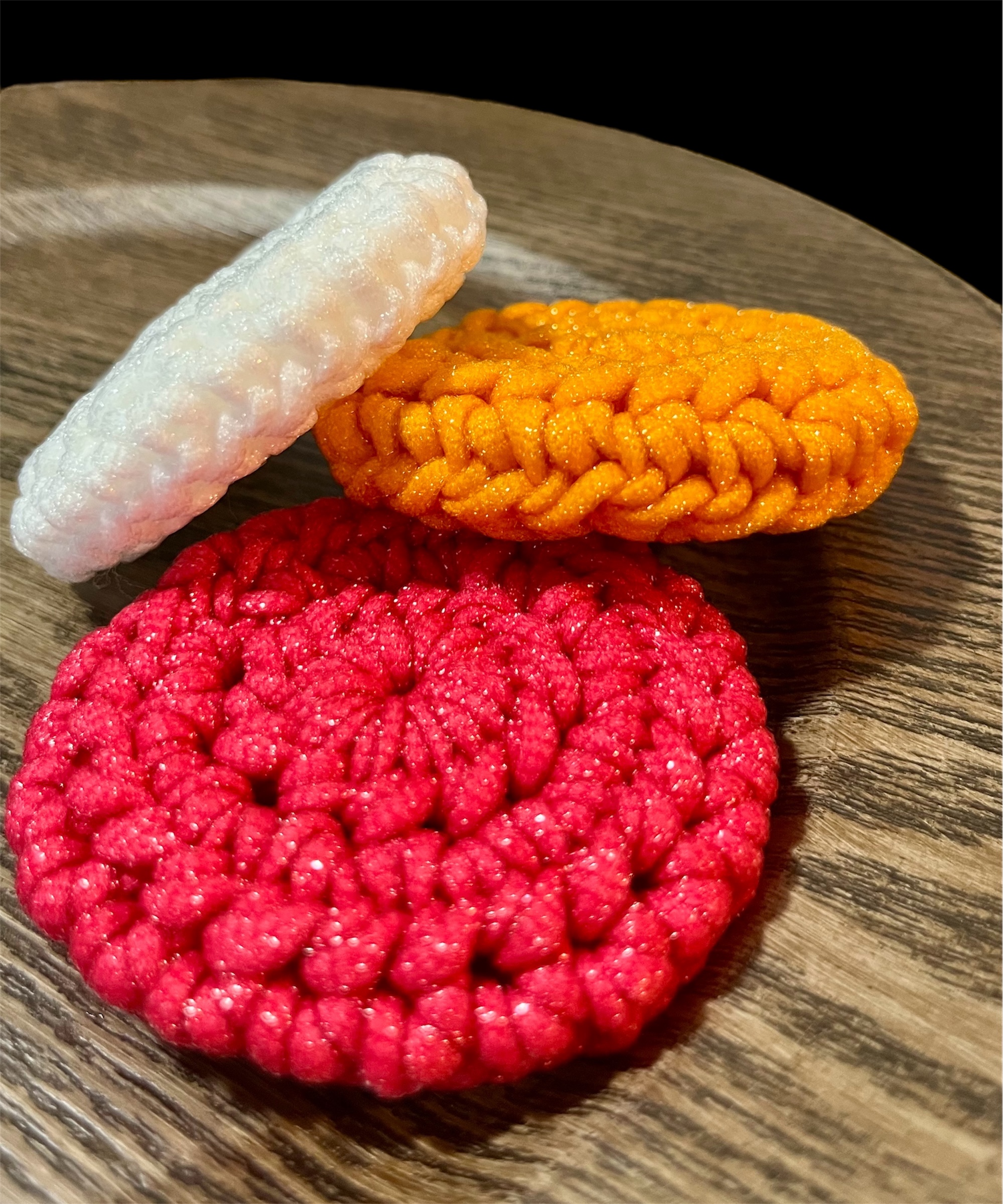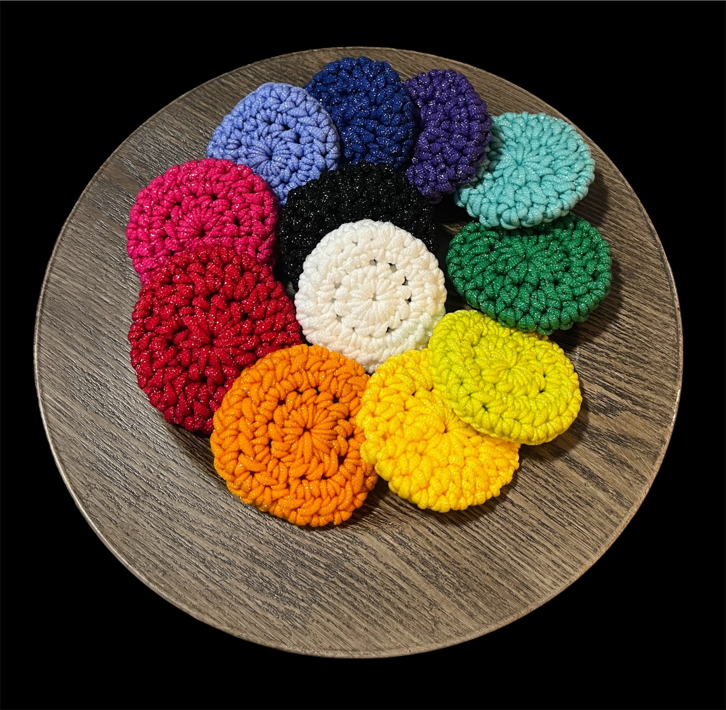 The Dish Scrubby comes in 12 vibrant colors and is available in two sizes. Small is approximately 3 inches in diameter and Large approximately 4.5 inches in diameter. Each size is double layer with a thickness of approximately half an inch and weighs less than one ounce.