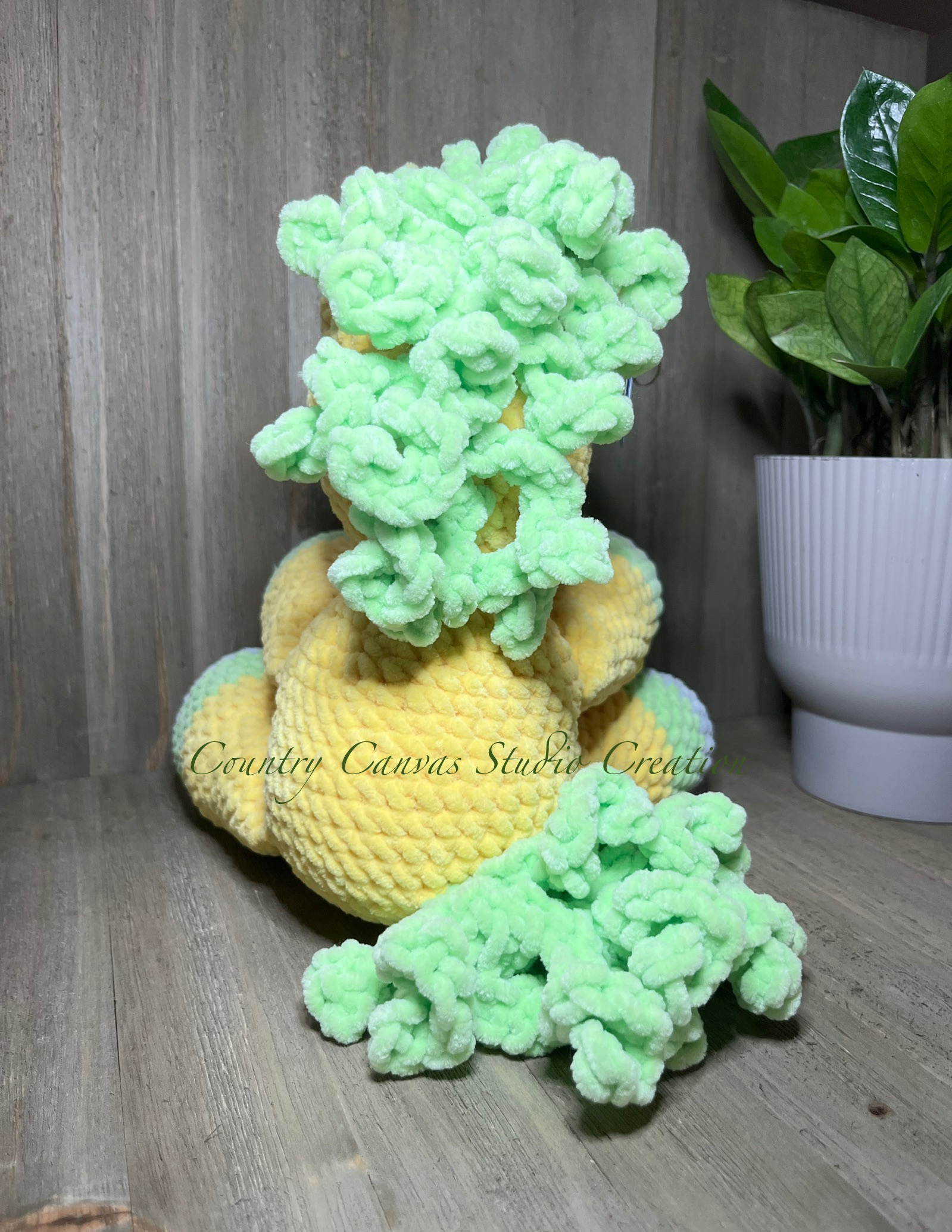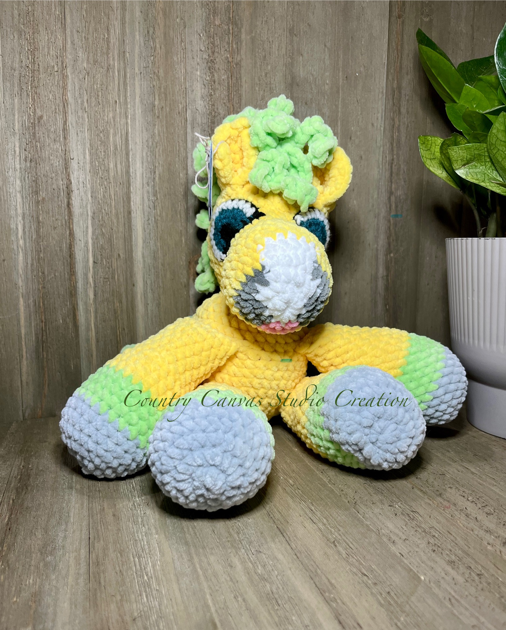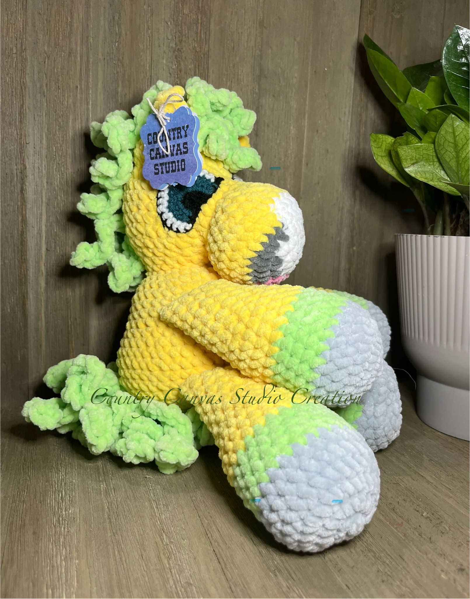 Sunshine is a bright yellow plush crocheted stuffed horse, it is expertly handcrafted with attention to detail, offering an old world, charming and unique design. Made from high-quality 100% plush acrylic yarn, it combines durability with a soft, plush and cozy texture. It has a yellow body with lime green accents and child-safe crocheted eyes. Sitting at approximately 9.5 inches tall it’s size and adorable appearance make it an excellent gift idea for any occasion or a delightful decorative addition to your space. Celebrate the art of crochet with this timeless and thoughtfully made creation.
